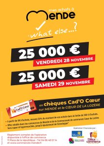 L’opération « Mes achats à Mende, What Else… ! » revient cet automne pour vous permettre d’être remboursé à hauteur de 20 % sur le montant de vos achats sous forme de chèques Cad’O Cœur le vendredi 28 et samedi 29 novembre 2025. Cette année le montant des enveloppes journalières s’élève à 25 000€ soit 50 000€ au total sur les deux jours de l’opération.